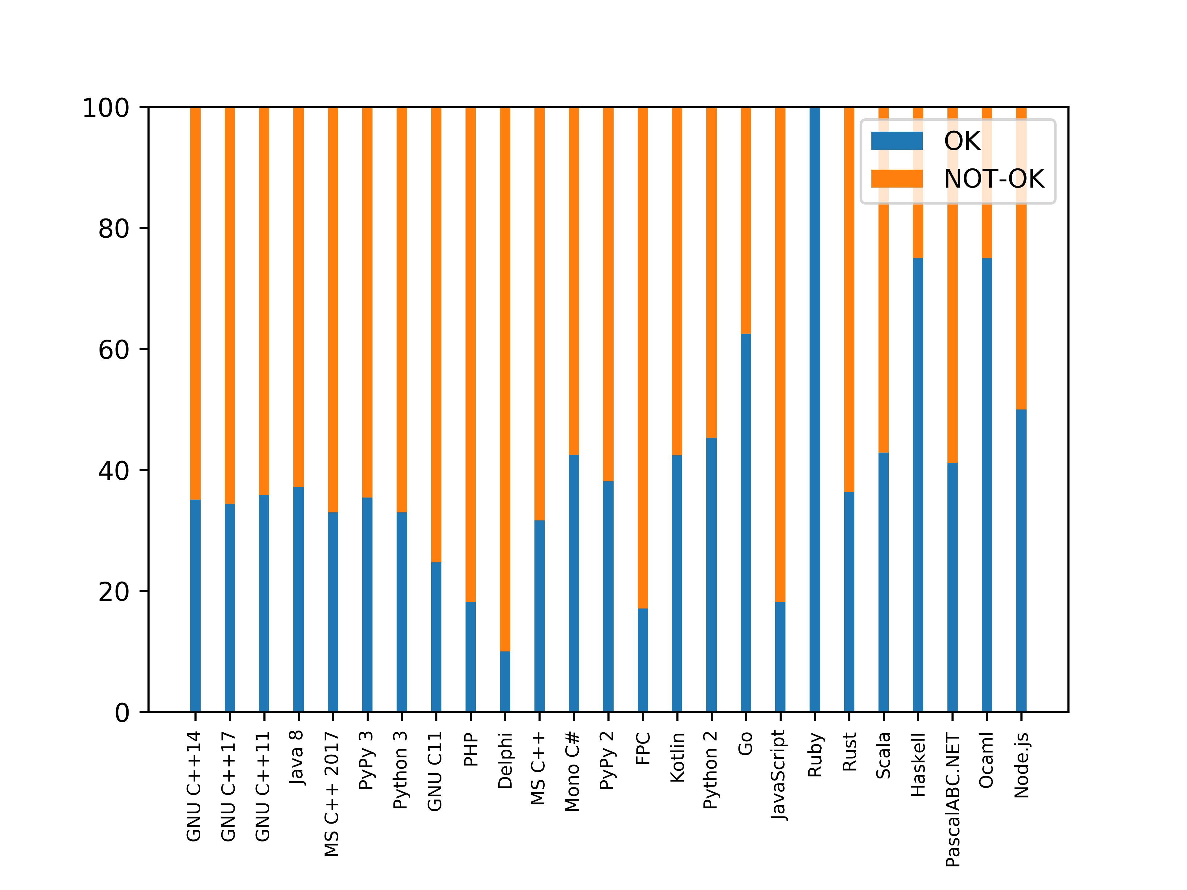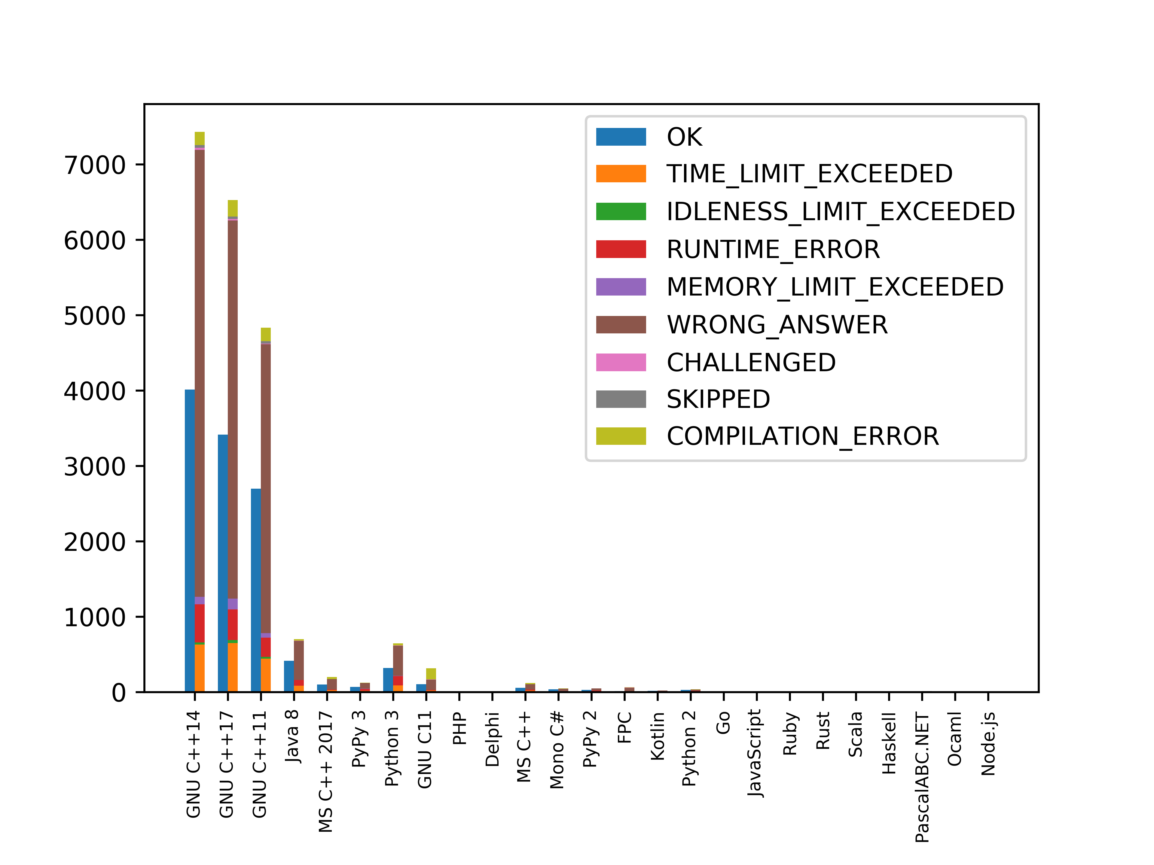 This bar chart shows us the number of submissions for each languages and segregates them into statuses with a unique colour per status . In the legend, all categories except OK are of Non-OK types. All Non-OK types are stacked one over the other. Quite a few WRONG_ANSWER types in brown.